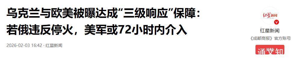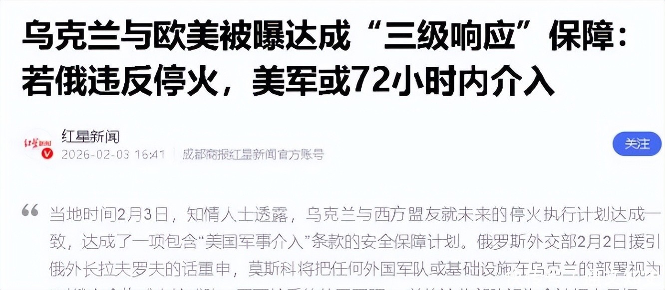 参考信源:乌克兰与欧美被曝达成“三级响应”保障:若俄违反停火,美军或72小时内介入 2026-02-03 16:42·红星新闻