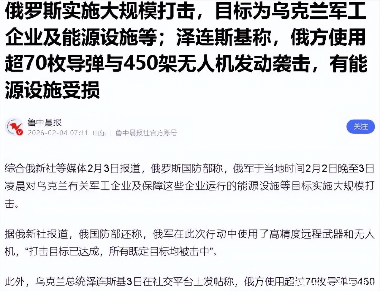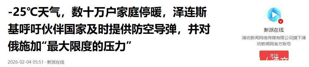 -25℃天气,数十万户家庭停暖,泽连斯基呼吁伙伴国家及时提供防空导弹,并对俄施加“最大限度的压力” 2026-02-04 05:51·新派在线