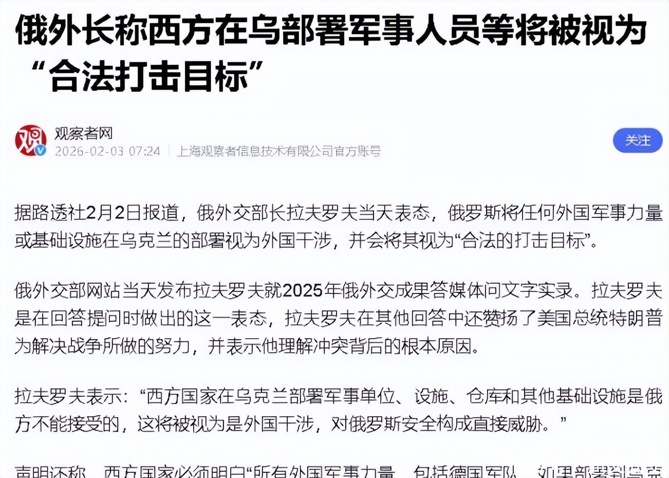 俄外长还放话:“将把外国军队或基础设施在乌克兰的部署视为合法打击目标。”