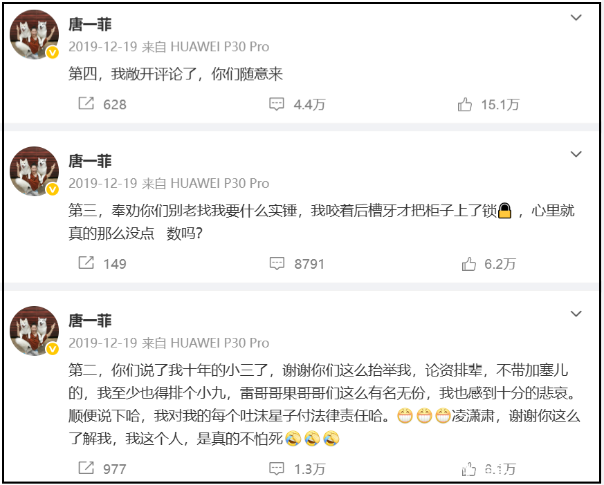 压力之下,唐一菲崩溃了,连发五条动态怼网友,强调自己没有当小三。