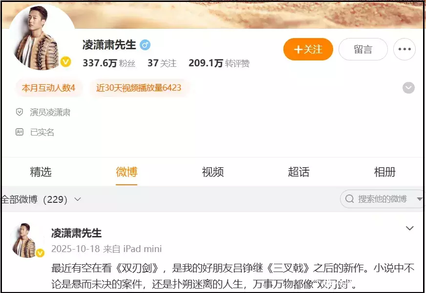 几大平台围观下来,会发现凌潇肃近年愈发低调了,短视频账号停更五年,微博停更了几个月,都好久没有主演剧集播出了。