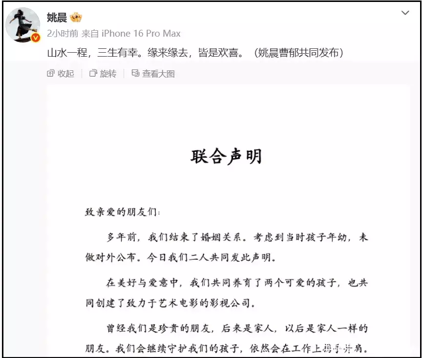 姚晨和曹郁一样逃不过,姚晨再次离婚之后,尽管双方竭力表现出体面,离婚声明都字字斟酌,还是有爆料称姚晨的第二任丈夫也出了轨。