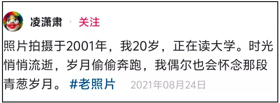 原来凌潇肃的短视频账号停更许多年了,最新一条还是发布于2021年,他分享了一张20年前的老照片,当时凌潇肃还在读大学,他说——“时光悄悄流逝,岁月偷偷奔跑,我偶尔也会怀念那段青葱岁月”。